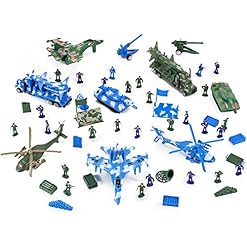 Combat Soldier set includes Blue and Green Troops. 28 Soldiers up to 2 inches tall. Includes tent, bunkers, and tons of military accessories. Scaled Vehicles include: Tank, Fighter Jet, Helicopter, Missile Carrier. Excellent quality and detail! Great gift for kids! Great Army Men collectible.