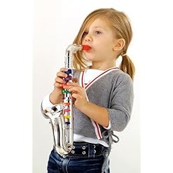 This toy saxophone by Bontempi has 8 keys and can play a scale and the keys are color coded so children can play songs that are printed on the back of the box