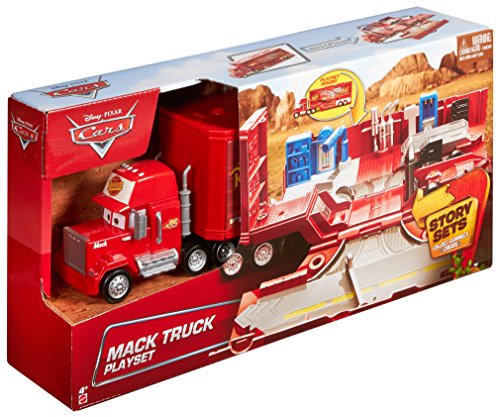 Inspired by Disney/Pixar Cars, this Mack Truck and Transporter delivers two big ways to play! As a transporter, Mack proudly carries Lightning McQueen to places near – like Radiator Springs – and far – like worldwide races. Then he parks his mega wheels and opens up to reveal multiple play areas inspired by the movies! Kick back in front of the big screen TV with Lightning McQueen and his trophies. Grab a scrub and massage in the washing area. Get tuned up to champion performance on the working lift. Check out the local scenery on the viewing deck and fill ‘er up at the gas pump. Mack’s cab can also be detached from the trailer for more push around play. When the day and night’s drives are done, roll Lightning McQueen inside and fold Mack back up for easy storage. This iconic set celebrates the special friendship between Mack and Lightning McQueen and connects to other play sets and accessories in the Story Sets line, so kids can build out the exciting world of Radiator Springs! Ages 3 and older.