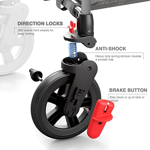 【DURABLE WHEELS】This wagons for kids is designed with 360° rotating front wheels and 12”easy-push rear wheels with one step foot brake . Four upgraded PU wheels with anti-shock system creates friction-free movement and smooth ride.