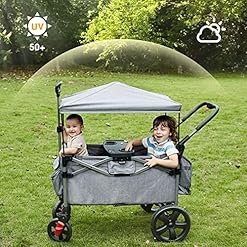 【DESIGN FOR SAFETY】Made of premium 300D polyester fabric and high duty steel frame that can hold up to 110 lbs. A detachable canopy to provide shade for your kids. Featured a rear foot brake, 5-point safety belt ensures baby maximum safety , our folding wagons have the JPMA certified meet ASTM safety standard .