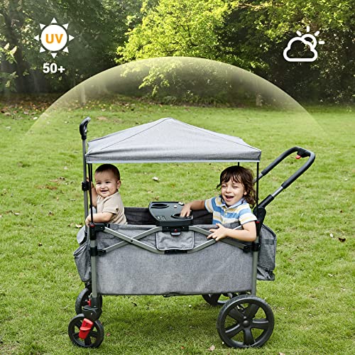EVER ADVANCED Foldable Wagons for Two Kids & Cargo, Collapsible Folding Stroller with Adjustable Handle Bar,Removable Canopy with 5-Point Harness
