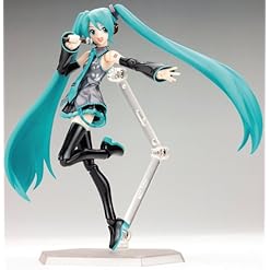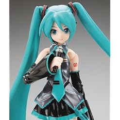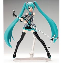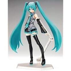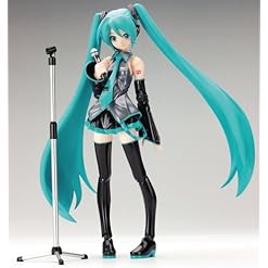 From Max Factory/Good Smile Company. Everyone is entranced by her beautiful voice. The long awaited figma version of Character Vocal Series 01: Miku Hatsune is here! The new joint parts allow for a smooth look, yet poseable movements, allowing you to pose many different scenes. A metallic coloring was used for parts of the body. Lots of detail was put into areas such as the sleeves and belt. There are two different face parts, and various hand parts. You can display her with her mike and mike stand to recreate her lively stage performances. The leek that fans know all too well has also been included – two of them in fact, so you can create all kinds of fun scenes. Her long twintail hair also has figma joints in it, allowing for more action poses. A poseable figma stand is included, which allows various poses to be taken.