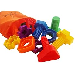 -Use your fine motor muscles to screw and unscrew these large plastic nuts and bolts! Put all pieces into the Skoolzy tote to keep all the nuts and bolts together.