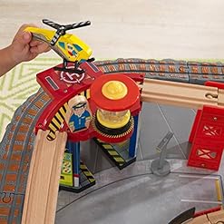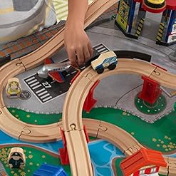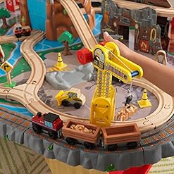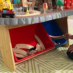 The KidKraft waterfall Junction train set and table is a perfect centerpiece to any playroom. The 112-Piece train set winds around and through the mountain, over and under the bridge and right through the towering waterfall to the other side. A working crane loads and unloads cargo from the train and a sturdy, molded plastic railroad track encircles the whole train table. With four included removable storage bins, cleanup is a snap. The sturdy wooden construction ensures this train table will provide years of safe, imaginative fun.