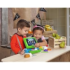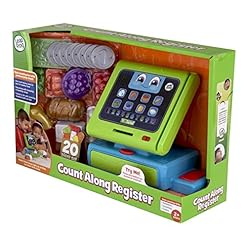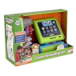 Ring up counting skills and pretend play fun with the LeapFrog Count Along Cash Register. Little shoppers ages 2 years and up have big fun in store with a two-piece set that talks, sings & counts. Add counting to the cart along and aisles of imaginative role play with a spunky, singing register pal that comes to life with cool songs and fun phrases. Little shoppers can run their own store for the very first time from the moment their register pal powers on with an “open for business!” Eight yummy pretend play food items correspond with matching buttons on the register’s touch screen. Press a button to hear the name and color of the food and shop ’til you bop with a matching verse of a shopping song. Listen to the crunch of egg shells followed by, “Oops! Guess we’ll make an omelette!” Press the number buttons 1-10 to hear the numbers and a counting song. Requires three AAA batteries to operate (demo batteries included).
