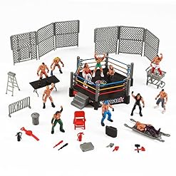 Royal Rumble style! 32 Pieces Miniature Wrestling Playset with assorted figures and accessories! Accessories include table, trash can, barricade, stretcher, cages, ladder, chairs, briefcase, extinguisher, cart, belt, etc.12 Assorted Wrestlers – Each Measures 2 inches tall. Wrestling Arena measures 5″ x 5″. Ages 3 and Up.