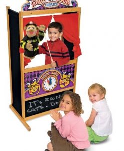 This puppet theater for kids measures 52″ H × 18″ W × 24.75″ L when assembled. It provides plenty of space for a single puppeteer or two. Our kids puppet theater allows children to tap into their imaginations to put on an entertaining show for family and friends. Puppet play encourages creative expression and storytelling skills. The theater contains small parts, and adult assembly is required. The Melissa & Doug Deluxe Puppet Theater is a great gift for kids ages 3 to 7 years. Add the Melissa & Doug Farm Friends Hand Puppets to round out the pretend play experience and give kids an engaging option for screen-free fun.