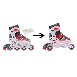 Recreational inline skates convert to three-wheeled training skates and back. Size adjusts using the button on the side; press it, and pull/push the toe in until it clicks. Conversion tools are included.