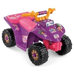 Built Fisher-Price tough with strong tires, a sturdy base, a cute cargo rack, and fun Dora the Explorer styling details! The Power Wheels Dora the Explorer Lil’ Quad is low enough for toddlers to easily get on and off by themselves. Cargo rack is situated in the back allowing toddlers to haul their favorite toys around. The Dora the Explorer Lil’ Quad is a real driving machine that drives 2 mph (Max.) forward and features tread tires that perform on both hard surfaces and grass, perfect for outdoor play!
