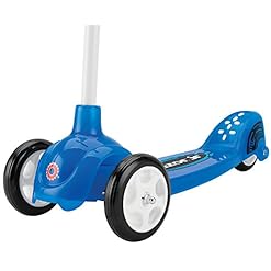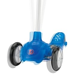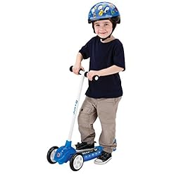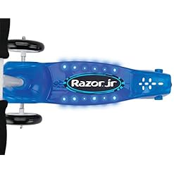 A cool blue Flash of fun! watch your little one transform into a futuristic whiz on wheels with the LED glow and three-wheel stance of the Lil’ tek. Cool blue lights Flash when your little rider steps onboard the translucent deck, while the tilt-to-turn steering and improved 20 degree turning angle allow for tighter turns to help them develop their riding skills. Features tilt-to-turn steering, three-wheel stance, steel handlebars, foam grips, and polymer wheel. Comes with two button cell Cr2032 lithium batteries one included and replaceable). approximate battery life: 20 hours or 3,600 cycles. Recommended for ages 3 and older and will support a rider up to 48 pounds. The buyer and rider of Razor Jr. Scooters are responsible for knowing and obeying all local, state and federal regulations regarding the riding and use of all Razor scooters.