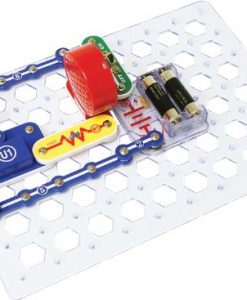 Create Working Electronic Circuits Snap Circuits Jr (SC-100) comes with over 30 components to create 101 different electronic projects. The pieces, which include snap wires, slide switches, an alarm circuit, a music integrated circuit, and a speaker, snap together easily on the included plastic grid–no soldering required. Each piece is numbered and color-coded to make identifying them easy. These components combine to create working circuit boards just like the ones found inside televisions, radios, and other electronic devices. With its easy-to-follow instructions, Snap Circuits gives your child a hands-on education in how electrical circuits work to run the everyday devices that they’re familiar with. They’ll also gain valuable lessons in building and in following instructions. The project manual includes large color illustrations and simple directions for each project. The projects include a sound-activated switch, a musical doorbell, a voice-controlled lamp, a flying saucer, and a light police siren. With these projects, children will experiment with things like electric switches, integrated circuits, digital circuits, fuses, and the transformation of circuit sounds into other sounds. Includes: Plastic snap-grid, 32 electrical components, and 1 project manual.Recommended for children 8 years and older.