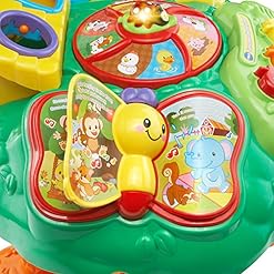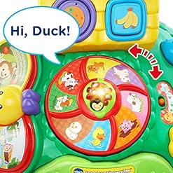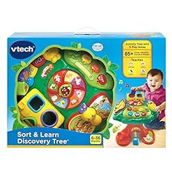 The Discovery Tree from VTech is an interactive activity center packed with age appropriate curriculum and fun play over 5 different play zones! 6 apple buttons teach colors and phonics, light-up ladybird spinning disk introduces 8 animals and insects, shape sorter teaches shapes and fruits, 4-page mini book introduces sing-along songs and cute caterpillar piano keys teach music notes and numbers. For added fun the shape sorter has three different paths for the shapes to fall down inside the tree trunk. Includes 4 sing-along songs, 15 melodies and lots of fun sound effects. Encourages language development, discovery & exploration and develops cognitive skills. Sort & Learn Discovery Tree Activity Table is for children 6 months to 3 years old; 2 AAA batteries are included for demo, use new batteries for regular use.