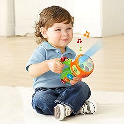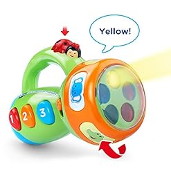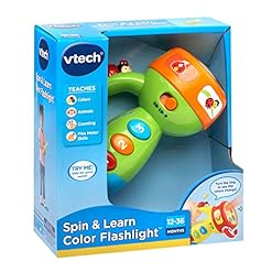 Light up and learn with the spin & learn color flashlight from VTech! The toy flashlight excites as it glows with a rainbow of five colors and plays exciting songs and music. Change the colors and listen to five fun animal sounds as you spin the dial and learn about colors and animals. Press the engaging ladybug button to hear phrases and sounds that teach numbers to playful melodies or count along and learn the numbers 1, 2, and 3! Over 50 sing-along songs, music, sounds and phrases engage learning fun. With its easy-to-grip handle, your toddler will want to take this learning toy flashlight with them on every adventure!